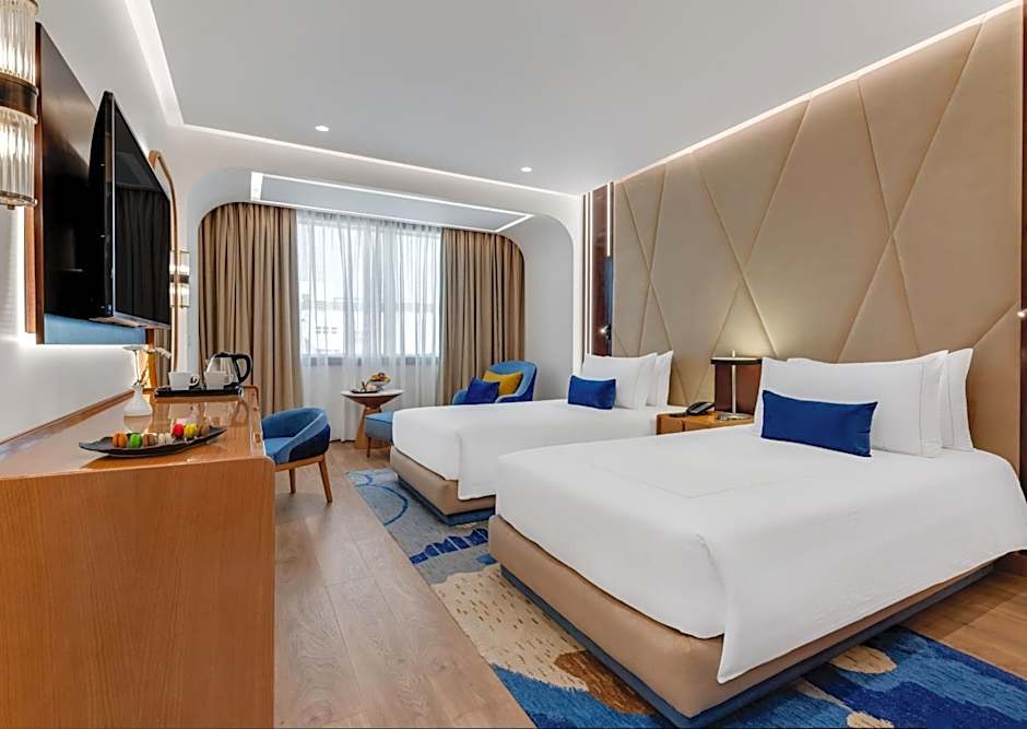 Deluxe room includes:- -Complimentary fruit basket upon arrival. -Complimentary two small bottle of mineral water once upon arrival. -Free tea and coffee making facilities. -Free daily local newspaper. -Free use of the fitness center (Gym) -Safety deposit box is available in all rooms. -Free high speed internet connection. -Luxury Fast Track Service with a fee.